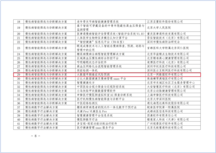一网成果 国家试点 2017, 2018, 和2019连续三年与国家人口与健康科学数据共享平台合作,开展国家首个“智慧健康乡镇”大数据重大疾病普查试点工程(下图:刘德培院士2018年在启动仪式上讲话) 国家第一批慢性病防治产品目录 二级医疗器械软件认证书