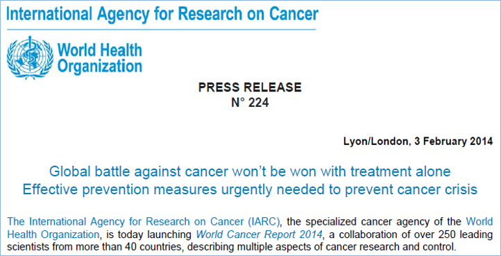 世界卫生组织(WHO)在2014年2月3日的新闻发布会上向全球呼吁:治疗已无法遏制全球的癌症危机,目前迫切需要来控制癌症疫情。